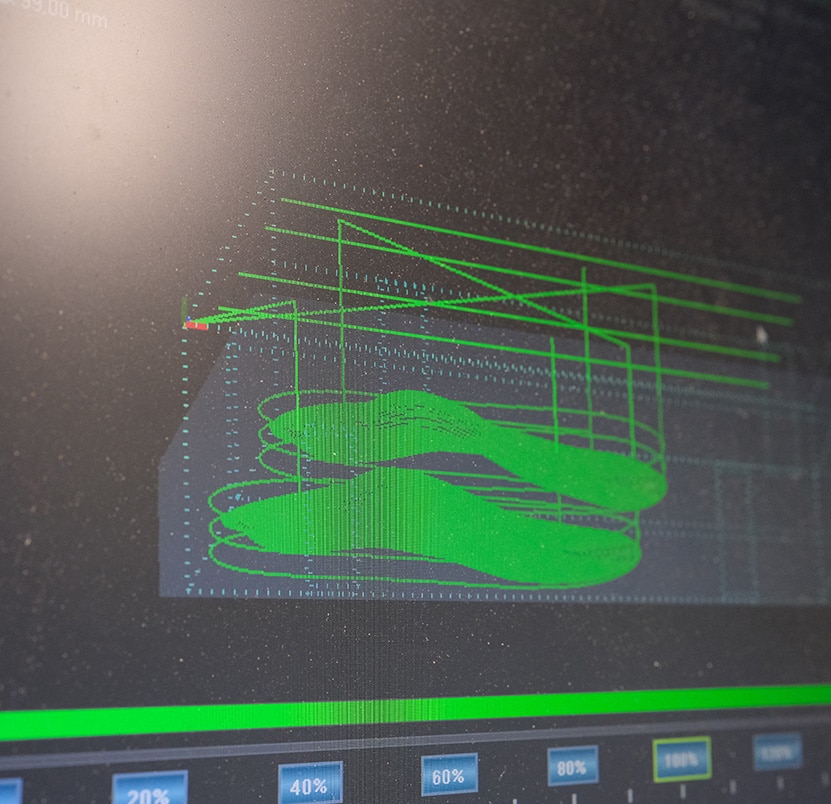 Die digital erfassten Fuß-, Bewegungs- und Haltungsdaten werden in einer speziellen Software verarbeitet. Anschließend modelliert der Orthopädie- Schuhtechnik-Meister ein exaktes digitales Fußbett und ergänzt gezielt Stütz-, Entlastungs- und Korrekturelemente. Die computergesteuerte CNC-Fräsmaschine setzt dieses Modell hochpräzise um und ermöglicht so eine millimetergenaue Umsetzung individueller Einlagenkonzepte.